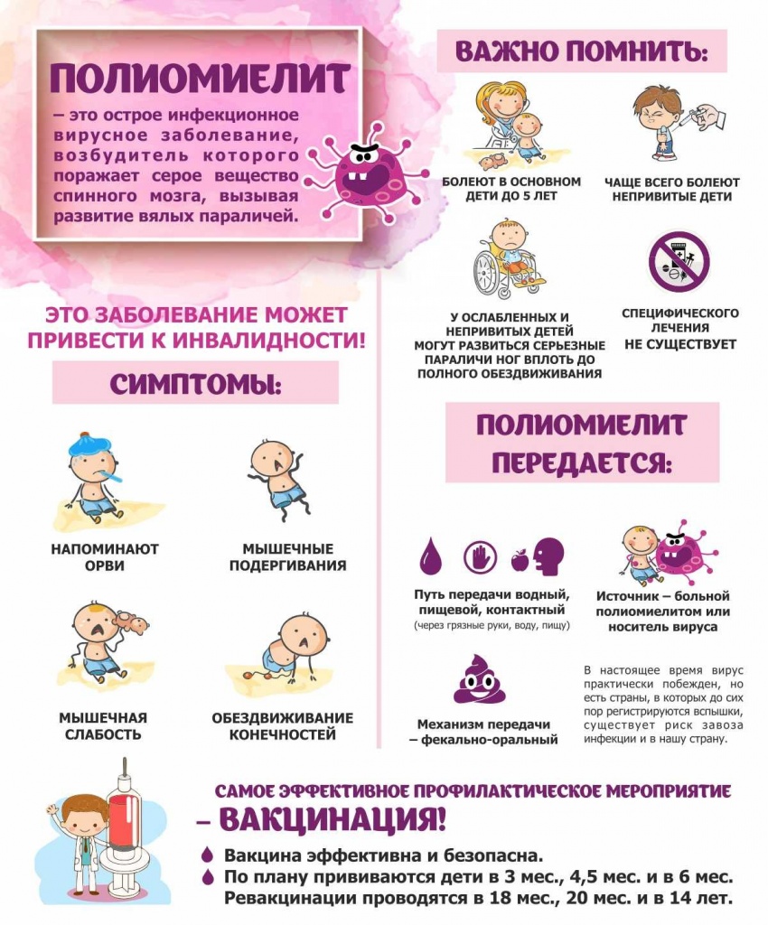 07.11.2022Полиомиелит является высокоинфекционным заболеванием, вызываемым вирусом. Он поражает нервную систему и за считанные часы может привести к общему параличу. Вирус передается от человека человеку, в основном, фекально-оральным путем или, реже, через какой-либо обычный носитель инфекции (например, загрязненную воду или продукты питания) и размножается в кишечнике. Первыми симптомами являются лихорадка, усталость, головная боль, рвота, ригидность шеи и боли в конечностях. В одном из 200 случаев инфицирования развивается необратимый паралич (обычно ног). 5-10% из числа таких парализованных людей умирают из-за наступающего паралича дыхательных мышц.
